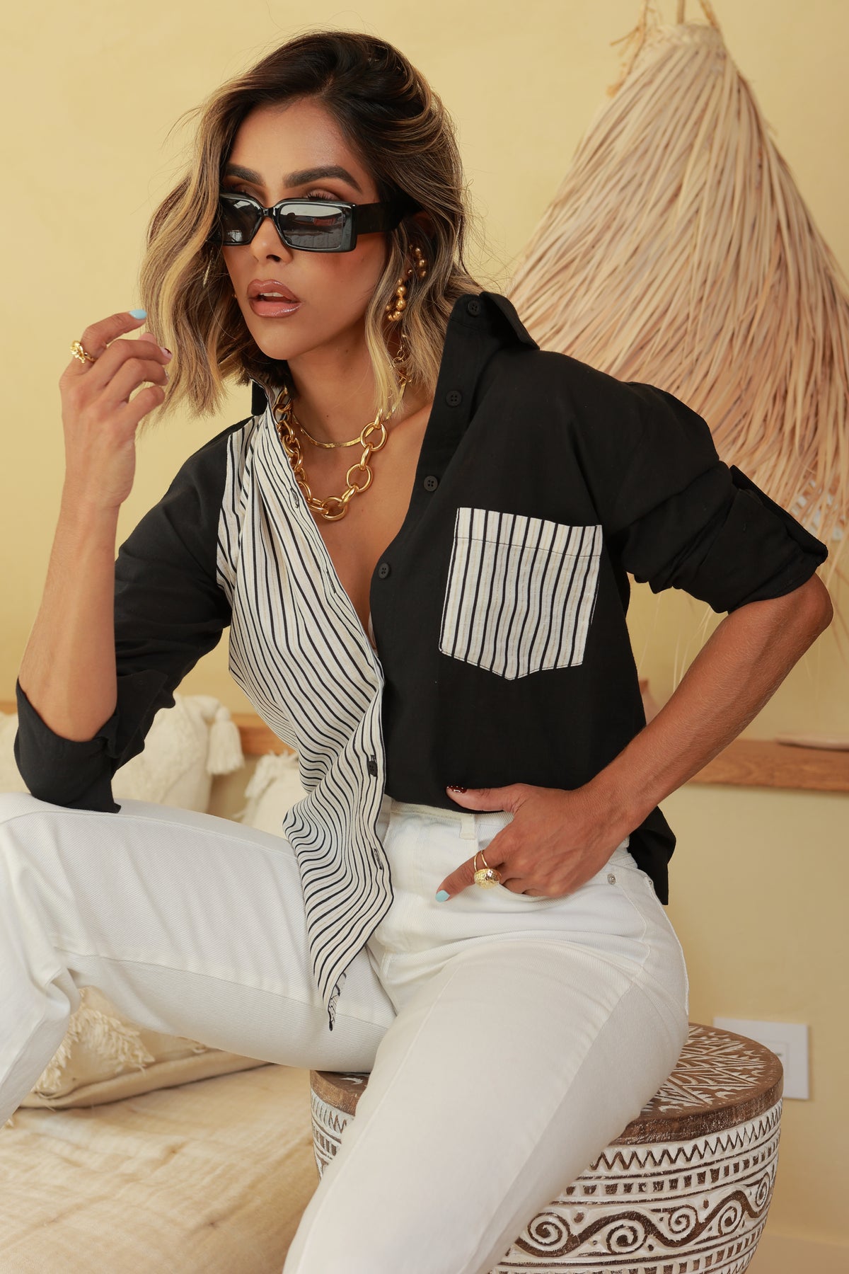 Su diseño bicolor la hace única: una mitad en negro sólido y la otra en beige con rayas negras y doradas. El detalle del bolsillo en el lado negro con contraste en tela rayada resalta y le da un toque sofisticado.