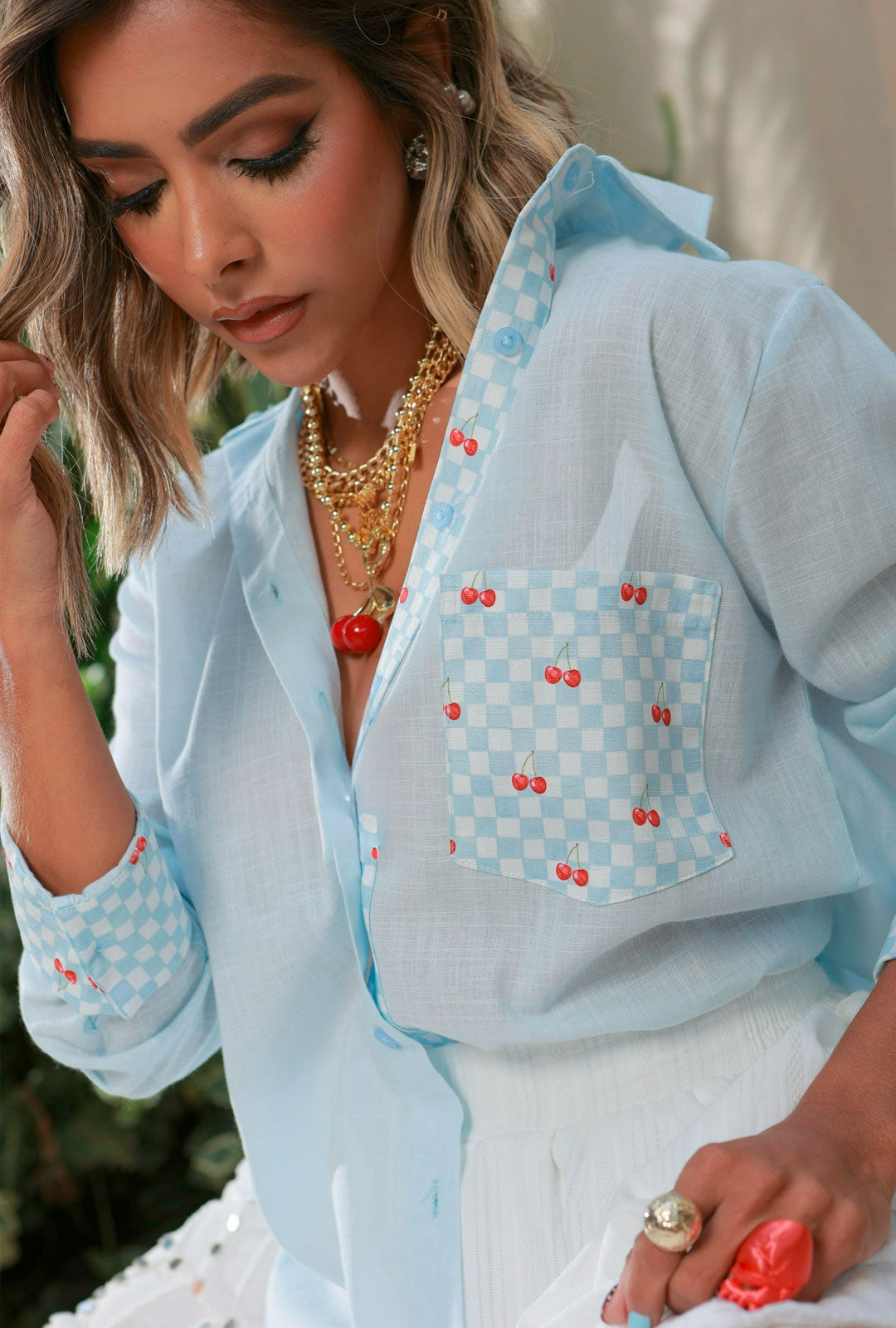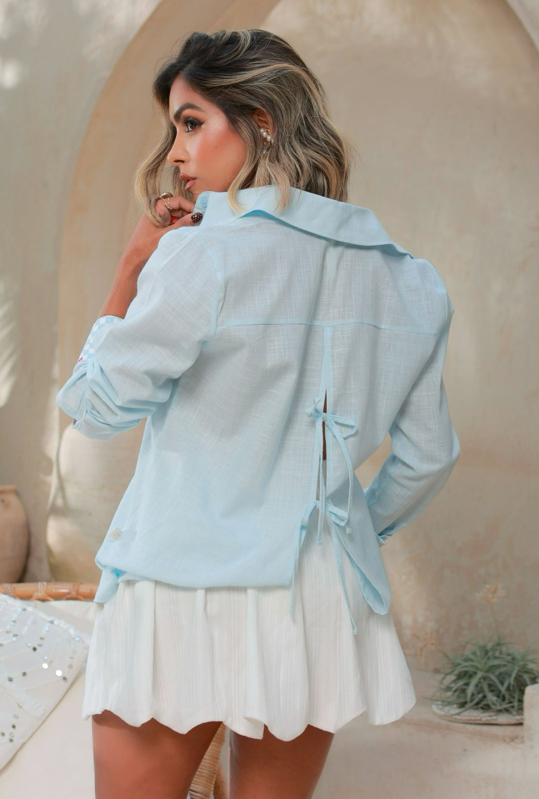 Descripción: Nuestra camisa Énora es pura frescura y encanto en lino, diseñada para resaltar tu lado más romántico. Su color azul cielo transmite serenidad, mientras que los detalles en cuadros celeste con mini cerezas en el bolsillo, el cuello y los puños le dan un aire coqueto y juvenil 🍒. La parte trasera sorprende con delicados lazos ajustables que aportan un toque femenino y único, haciendo de esta prenda un must-have versátil para combinar tanto con shorts como con jeans.